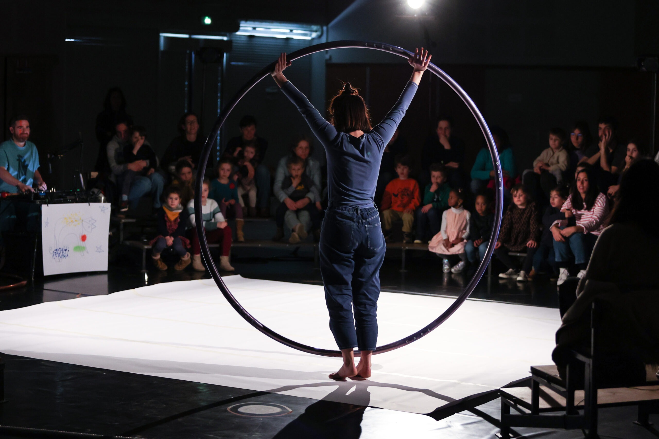 Une circassienne à la roue et un musicien, dialoguent autour de cette forme, faisant de l’art la matière même du spectacle.